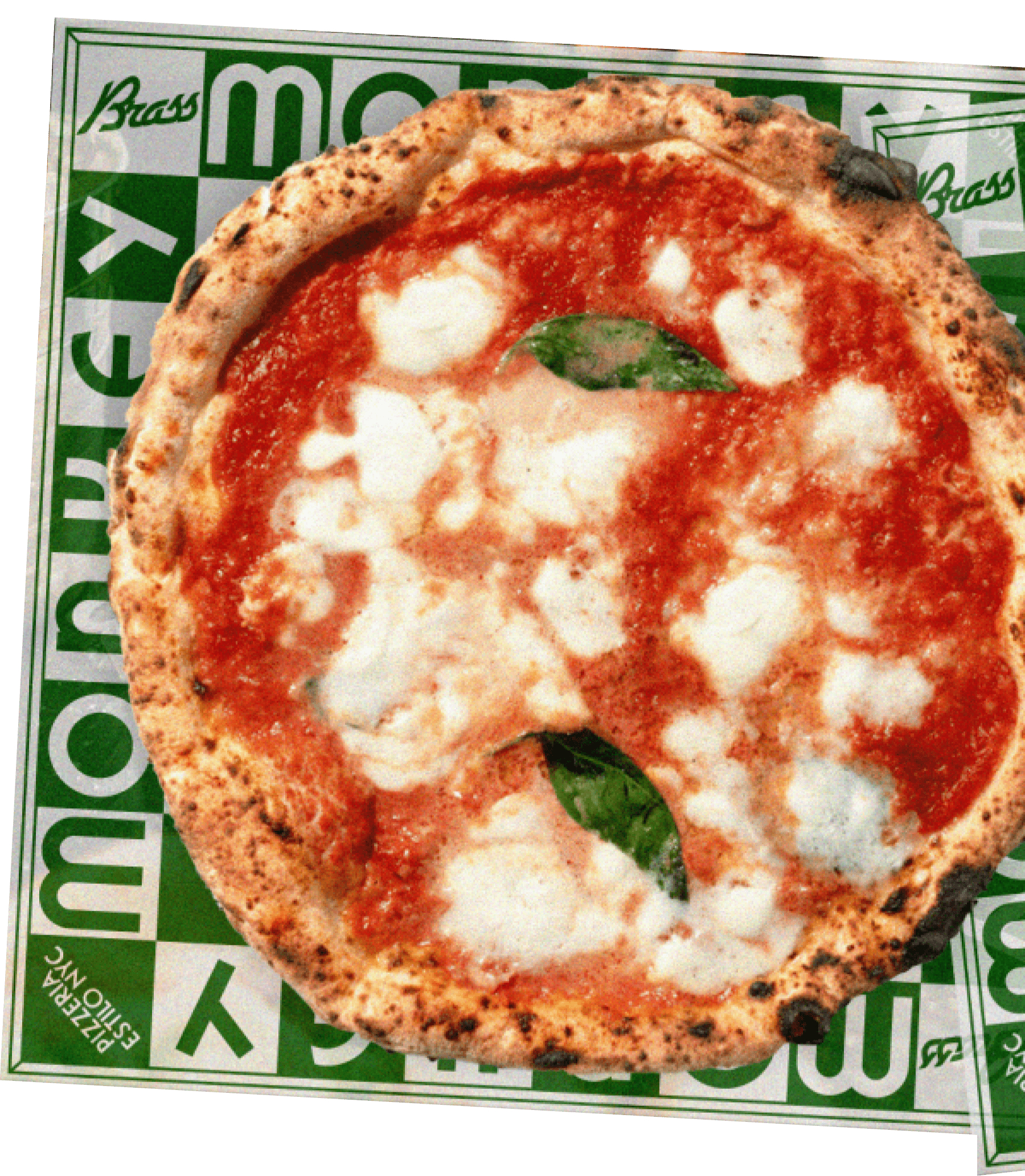 Nuestra salsa marinara de la casa mozzarella Parmigiano Reggiano y albahaca sobre una cama de mozzarella graunado